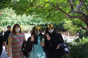 国際通りで買ったパイナップルのカチューシャをつけて園内を巡る生徒たち。はじめてバナナの木を見つけました。