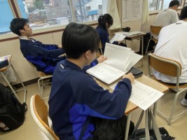 1Bは「生物基礎」の授業で、各自で試験勉強が行われていました。生物の試験は明日です。プリントを復習していた生徒が多かったですね。教科担任の大石先生に質問している生徒もいました。明日の試験で点数アップにつながるといいですね。明日からの定期試験は体調管理をして全員が実力を発揮できることを願っています。
