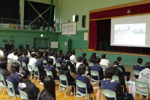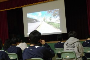 9月中旬、生徒会執行部が歩いて録画したコースがスクリーンに映し出されました。道順や関門の設置場所などを全校生徒で確認しました。ゴールの学校調理室ではPTAで調理してくださるうどんが生徒の到着を待っています。楽しみですね。5杯までおかわりOKなど、注意事項が説明されました。