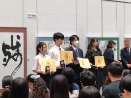 様々な美術作品が展示されるなか、小樽明峰高校書道部6名の部員たちは顧問の白鳥教頭と出品しています。