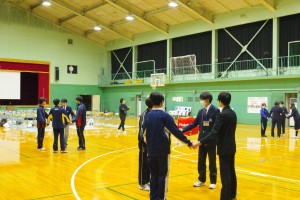 本校体育館に集まった参加者を前に司会進行の生徒が全体会を運営しました。小池校長の挨拶、安田生徒会長の学校生活紹介、大石教員の学校行事紹介。