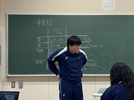 今日の5時間目のLHRでは、冬季体育大会の選手決めが行われました。昼休みに保体常任委員会が開かれ、要項や今後の日程の確認がされました。各クラスでで要項やルールの説明、各種目の選手決めが進められました。