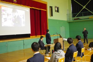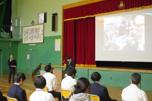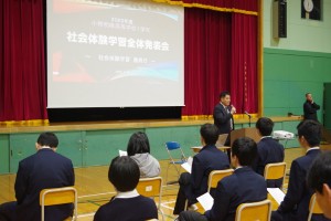 前回の授業はグループ毎に発表会を開いて10名の代表を選びました。今日は10名が1年生全員の前で体験レポートを発表しました。それぞれの体験の様子がスライドで紹介され、1年生全員で体験学習を振り返りました。